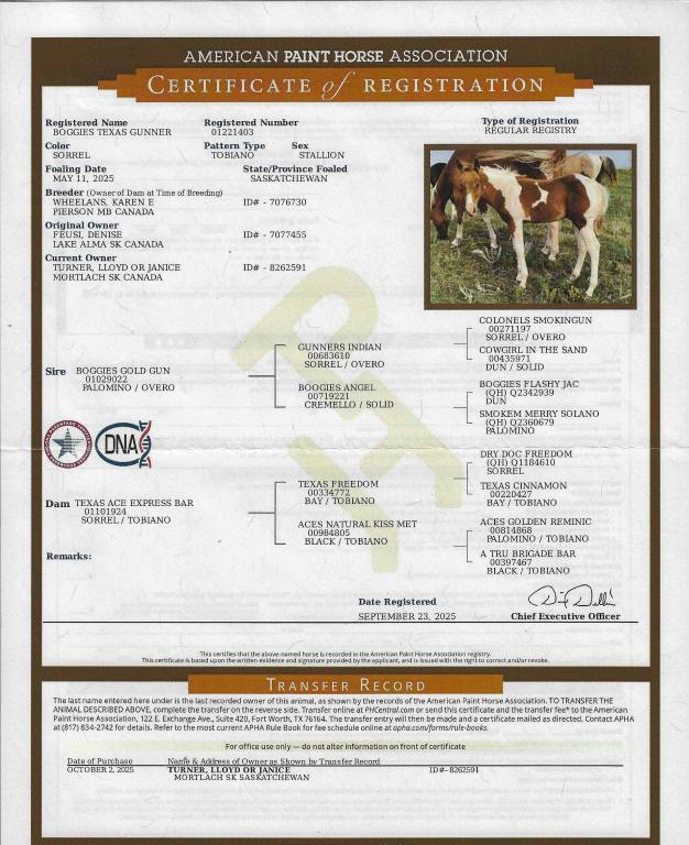 Lloyd and David Turner (Turner Bros.) purchased Dry Doc Freedom as a yearling and brought him to Canada.